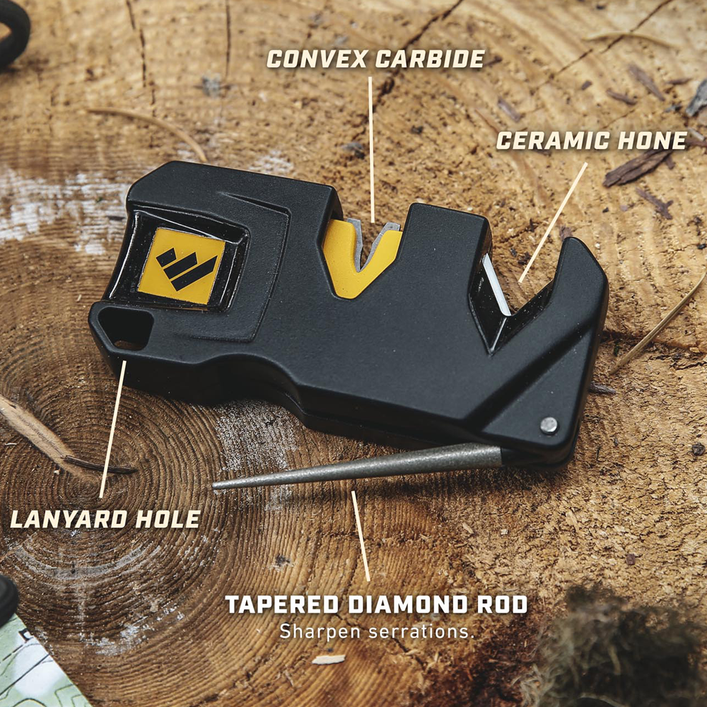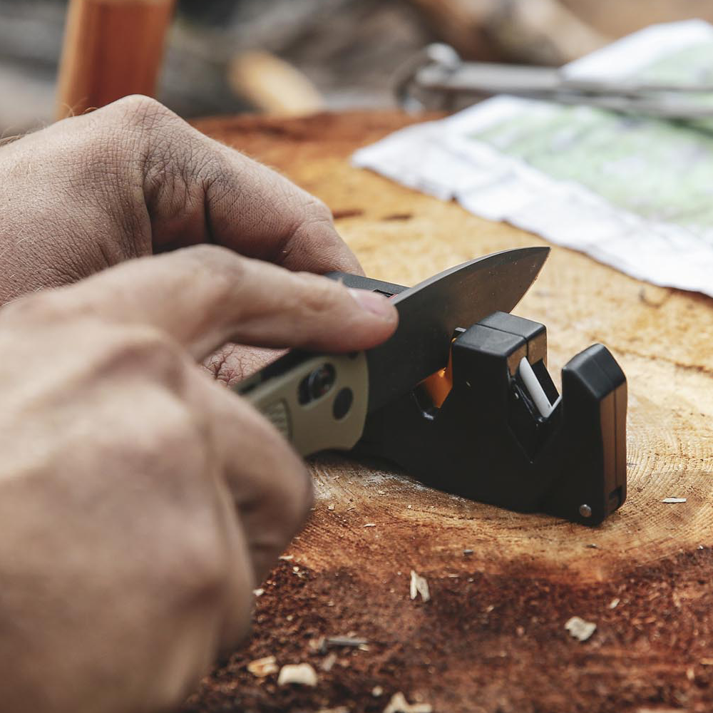 Kleiner und handlicher Messerschärfer von Worksharp. Kann einfach in die Tasche oder den Rucksack gesteckt werden und bietet mehrere Schleif- und Feinschleifmöglichkeiten.