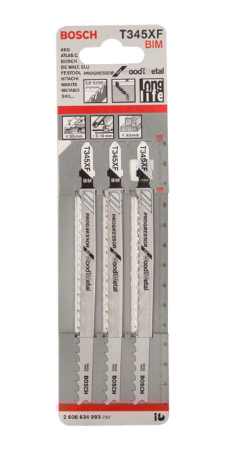 Zur Verwendung mit Stichsägen mit T-Schaftsystem zur Befestigung. Das T 345 XF Progressor for Wood and Metal Stichsägeblatt ermöglicht schnelle, gerade Schnitte in dickem und dünnem Holz mit Metall. Seine Zahngeometrie mit progressiv zunehmender Zahnung ermöglicht die Bearbeitung von Materialien mit stark unterschiedlichen Dichten. Darüber hinaus ist die gewalzte Seitenschneide für schnelle Schnitte ausgelegt. Seine vollständig gehärtete Zahnreihe aus HSS (Schnellstahl) ist mit seinem Körper aus hochelastischem HCS (Kohlenstoffstahl) zu einem Bimetall verbunden, das das Blatt für das Sägen von metallumhülltem Holz mit Stahlkomponenten mit Standardfestigkeit geeignet macht. Es hat eine progressive, große Zahnung (2,4–5 mm) und eine beträchtliche Länge (132 mm) und kann verschiedene Arten von metallumhülltem Holz mit einer Dicke von bis zu 65 mm schneiden, z. B. ungehärtete Nägel, Schrauben und Befestigungselemente.
