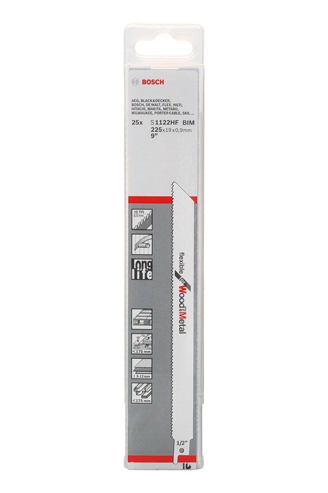 Zur Verwendung mit Tigersägen mit einem Universalschaftsystem von 1/2 Zoll. Das S 1122 HF Flexible for Wood and Metal Tigersägeblatt schneidet gleichmäßig in Holz und Metall. Die Materialstärke (0,9 mm) in Kombination mit der Standardlänge (225 mm) ermöglicht ein gleichmäßiges Sägen. Die BIM-Kombination (Bimetall) aus einem HCS-Blatt (Hochleistungsstahl) und einem HSS-Verzahnungsblatt (Schnellstahl) macht das Tigersägeblatt optimal für die Reparatur von Lastpaletten. Das Blatt hat eine mittlere Zahnteilung (2,5), die durch alle weichen Nägel und Befestigungen in Lastpaletten schneidet. Es hat eine Standardlänge von 225 mm und eine Schneidleistung von bis zu 175 mm.
