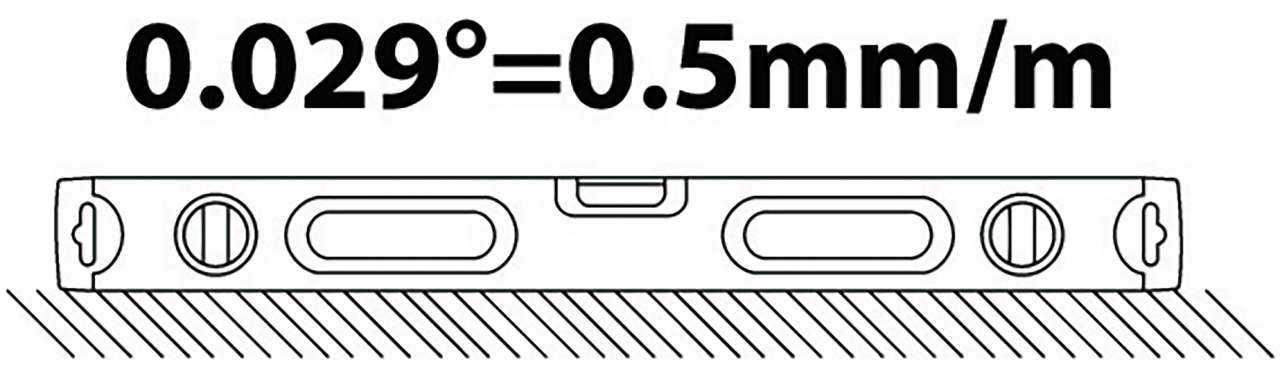 - Vier Linien auf jeder Seite der Libellen. Die größte ist der Nullpunkt. Jede Linie gibt zusätzliche 1 mm/m für die Fasung