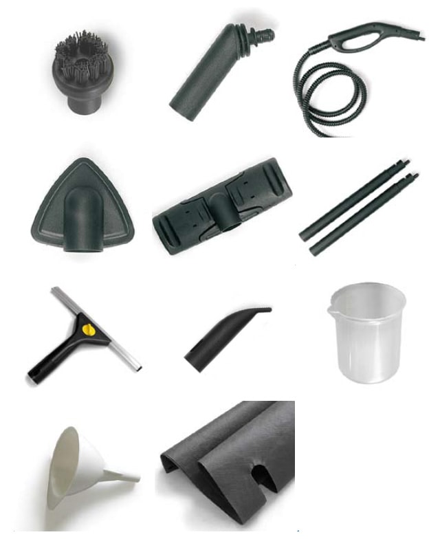 Das Gerät verfügt über doppelte Thermostate, Zubehör- und Kabelhalter. Lieferumfang: 3 m flexibler Schlauch, rechteckige Düse, dreieckige Düse, gewinkelter Dampfpistole, Fensterdüse, Polyesterbürste, Baumwollfilter, Tuch für die dreieckige Düse und 6 m Netzkabel.