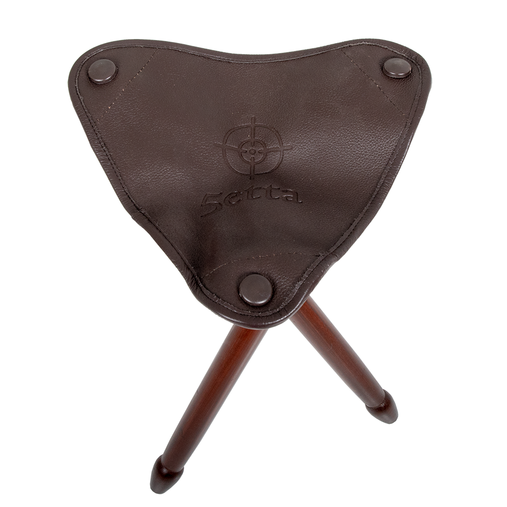 Dreibeiniger Jagdstuhl mit Sitz aus starkem braunem Leder.